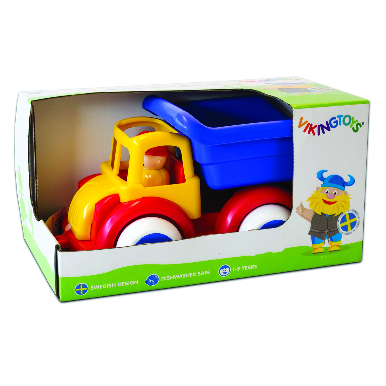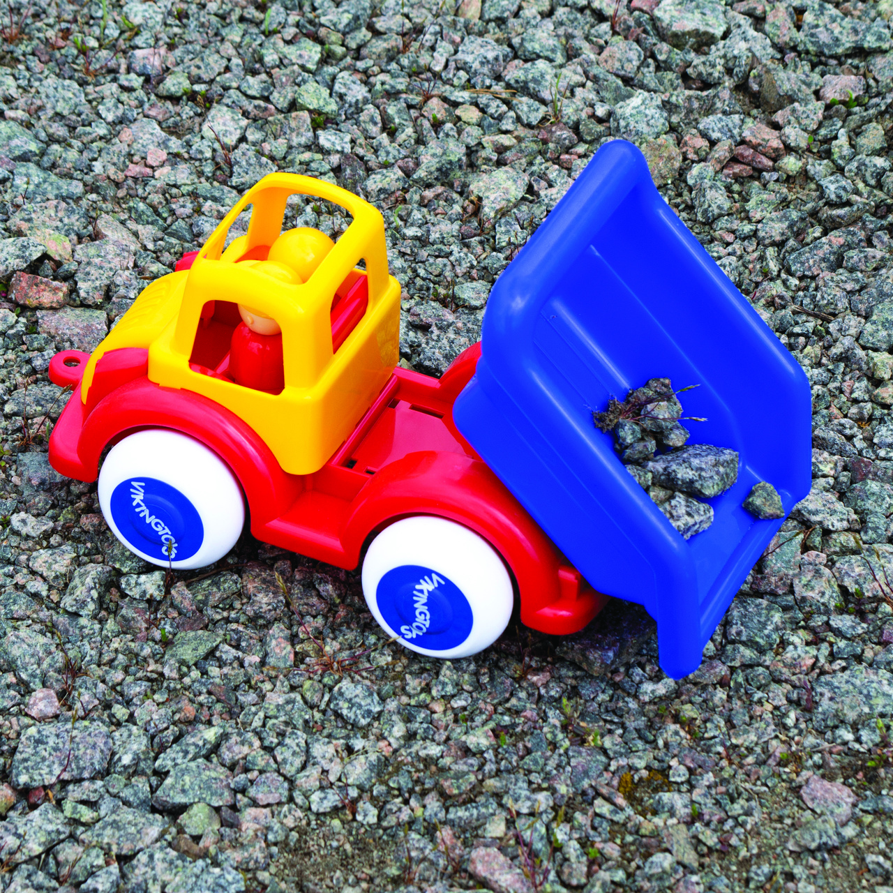 Our robust Jumbo truck is perfect for loading and dumping material on the play construction site. If it’s too heavy you can always ask the two little construction workers that are included in the giftbox for help. The truck is as safe to play with outside, the heavy-duty material won’t fade or become brittle from the weather. That’s nice to know since even dearly beloved toys are sometimes forgotten in the sand box.