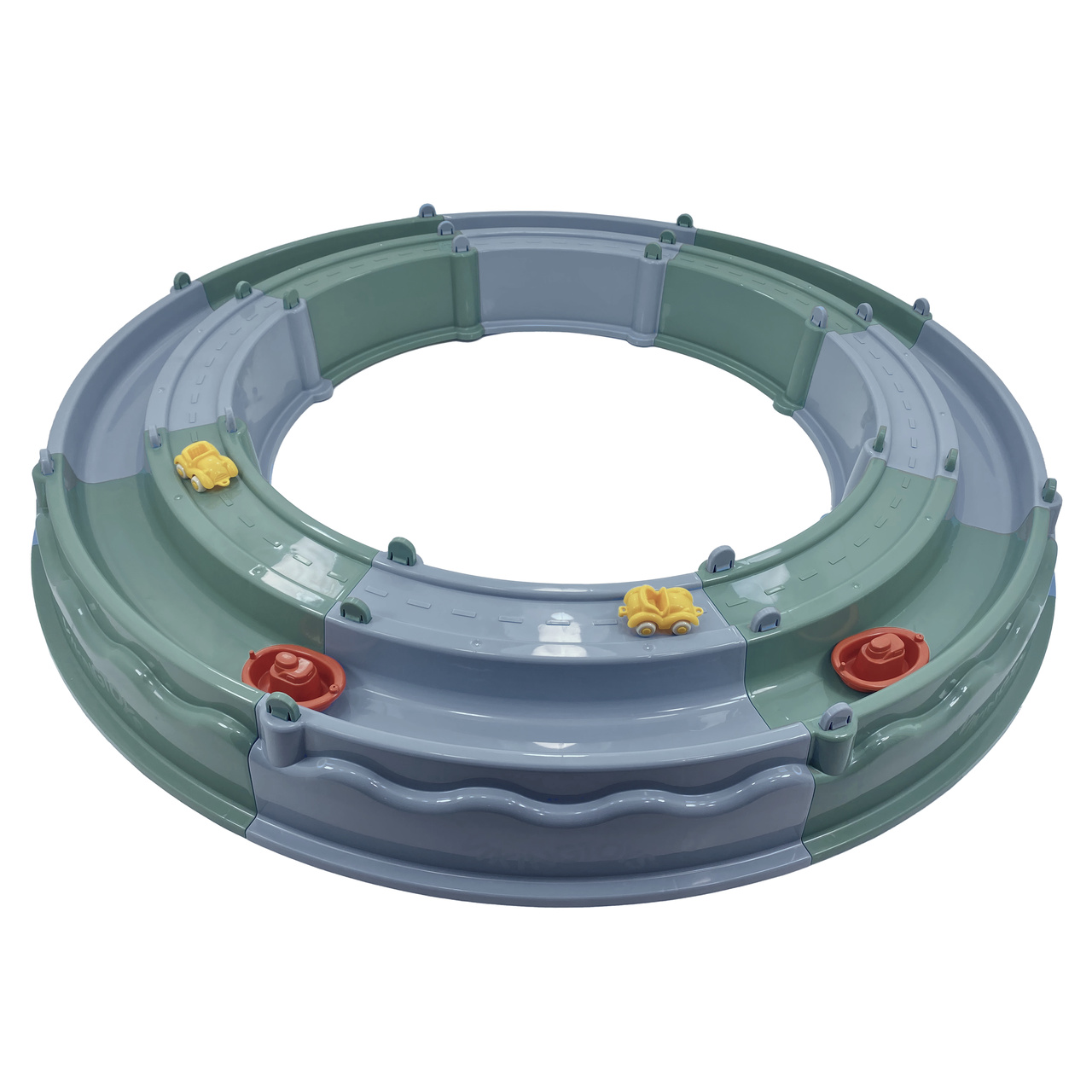 Our stackable sand pit in recycled plastic with a path for water and boats as well as one path for roads and cars will entertain the kids for hours and hours. It can be used outside as well as inside. The playset also includes 2 mini chubbies & mini boats.